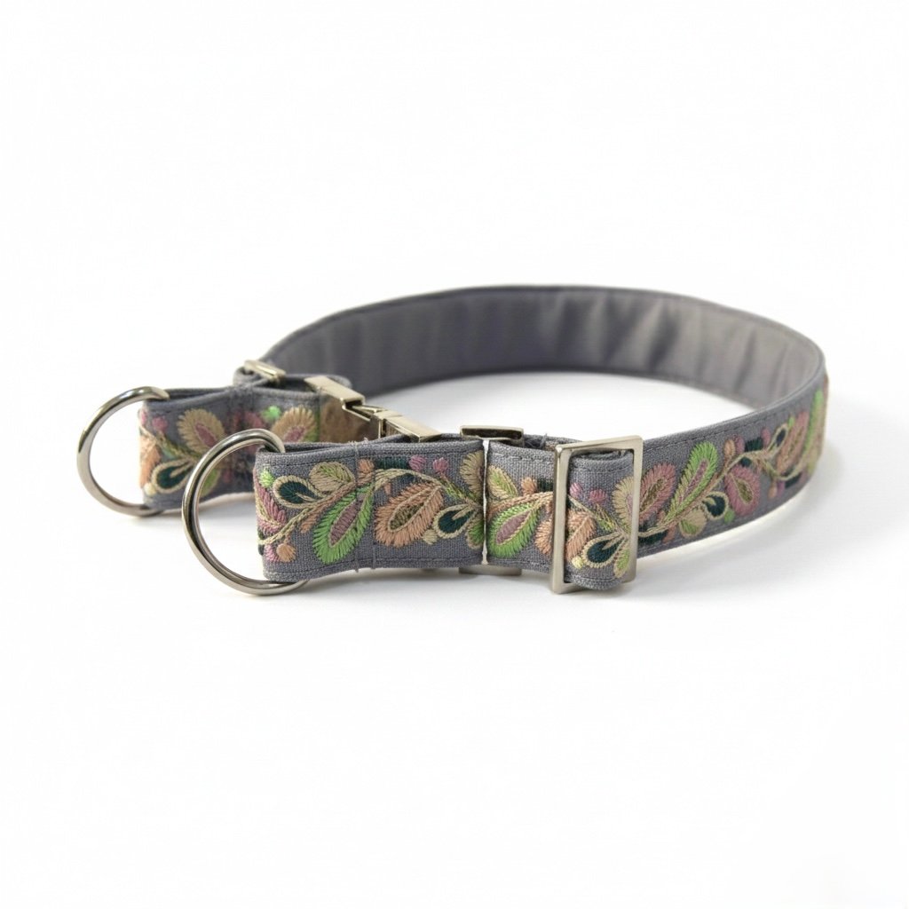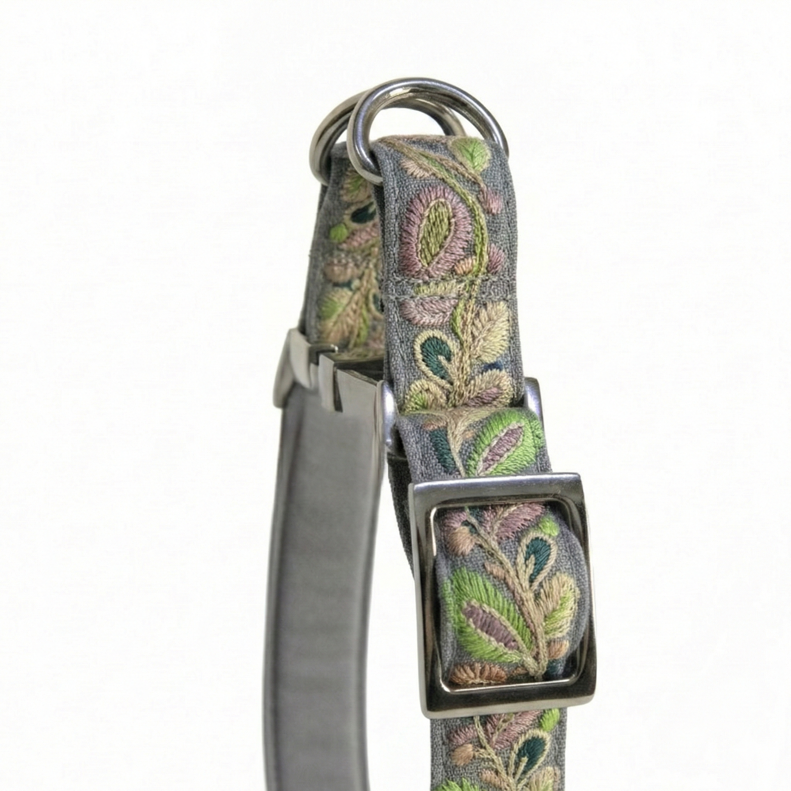 Rooted in nature and crafted with intention, the LEAF TRAIL No-Pull Neck Collar by MITRAYA draws inspiration from winding forest paths and delicate foliage. Featuring intricate multicolour leaf embroidery set against a calm grey base, this collar feels timeless, artisanal, and quietly luxurious.